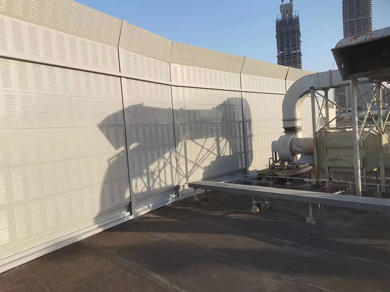 折角型聲屏障主要用于公路、高速公路、冷卻塔噪音治理。分為純隔聲的反射型聲屏障,和吸聲與隔聲相結合的復合型聲屏障,后者是更為有效的隔聲方法。指的是為減輕行車噪聲對附近居民的影響而設置在鐵路和公路側旁的墻式構造物。